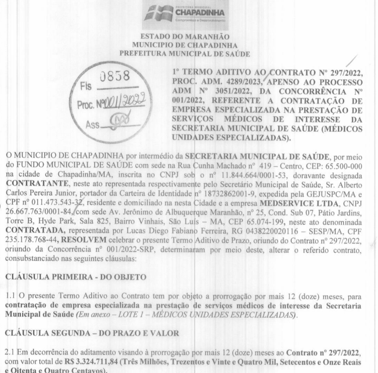 O contrato original, firmado em 2022, foi de R$ 19.385.394,76. Desde então, foram celebrados aditivos anuais, sem a criação de novos contratos: