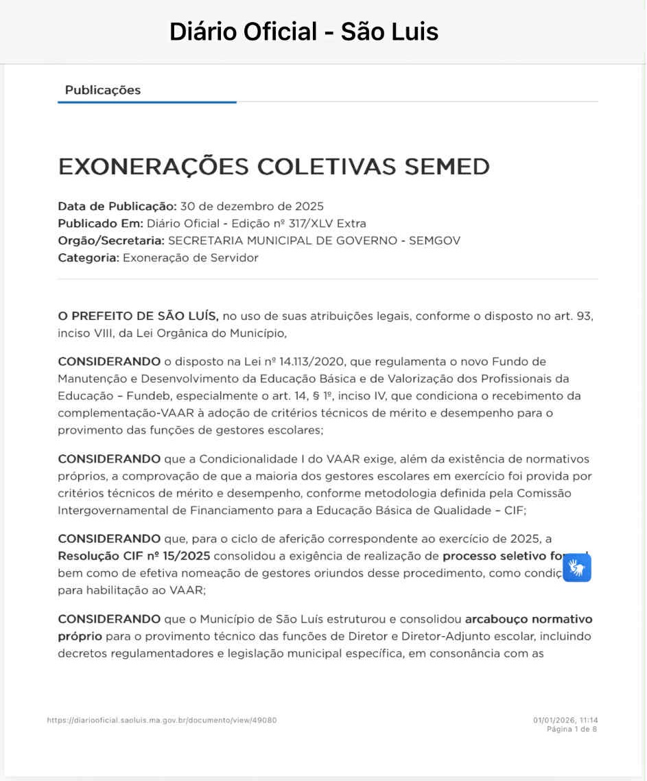 Na reta final de 2025, em pleno recesso escolar e às vésperas do início do ano letivo de 2026, o prefeito de São Luís, Eduardo Braide (PSD), publicou no Diário Oficial do Município uma série de exonerações que atingiu mais de 100 diretores adjuntos de escolas da rede municipal de ensino.