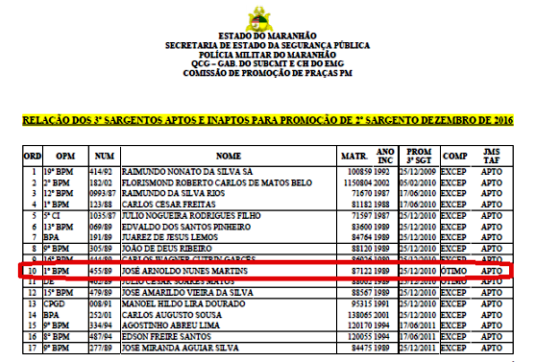 José Arnoldo Nunes Martins consta da lista de promoção conforme abaixo, isso após passar por uma “rigorosa” avaliação, cujo resultado lhe garantiu o comportamento “ótimo” e o JMS/TAF “apto”, enquanto muitos sargentos que sempre cumpriram suas obrigações e missões exemplarmente ficaram de fora. Os policiais que prenderam Arnoldo se surpreenderam quando viram que ele fazia parte do bando de assaltantes presos num corsa Classic.