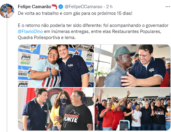 "De volta ao trabalho e com gás para os próximos 15 dias! E o retorno não poderia ter sido diferente: foi acompanhando o governador Flávio Dino em inúmeras entregas, entre elas Restaurantes Populares, Quadra Poliesportiva e Iema", ressaltou Felipe Camarão.