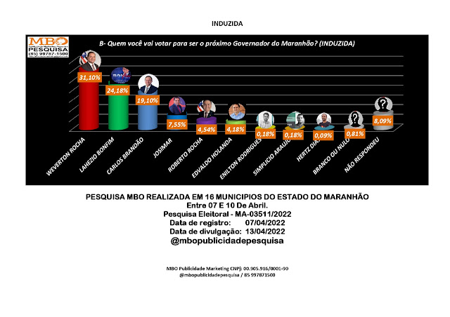 A MBO Pesquisa, que ouviu 1100 pessoas entre 07 e 10 de Abril em 16 municípios, mostrou que 26,10% dos eleitores pensam em votar em Weverton para governador. O segundo colocado, Lahésio Bonfim, já aparece em segundo lugar, com 21,91%, seguido por Carlos Brandão 18,36% das intenções de voto.
