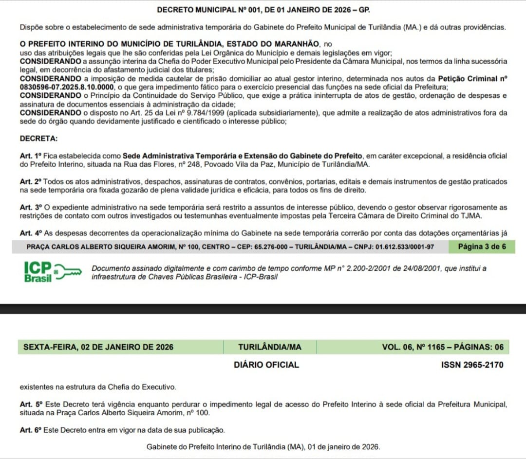 Cumprindo prisão domiciliar e usando tornozeleira eletrônica, o vereador e presidente da Câmara Municipal de Turilândia, José Luís Araújo Diniz, conhecido como Pelego, emitiu decreto, publicado no dia 1º deste mês, transferindo a sede da Prefeitura para a sua residência, localizada na Praça Carlos Alberto Siqueira Amorim, número 100.